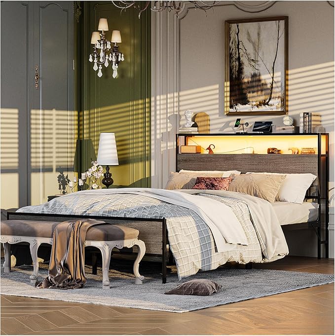 Base de Cama Matrimonial con Luz LED y Carga USB | Cabecera con Almacenaje, Metal y Madera 140x190 cm