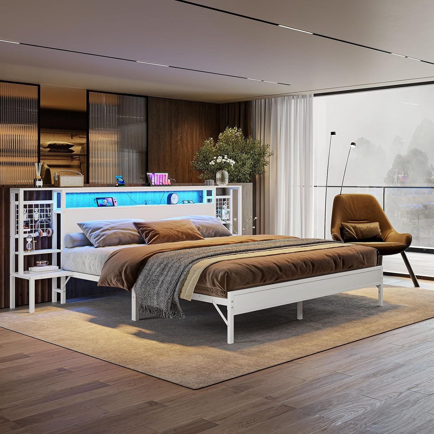 Base de Cama Matrimonial con Luz LED y Carga USB | Cabecera con Almacenaje, Metal y Madera 140x190 cm