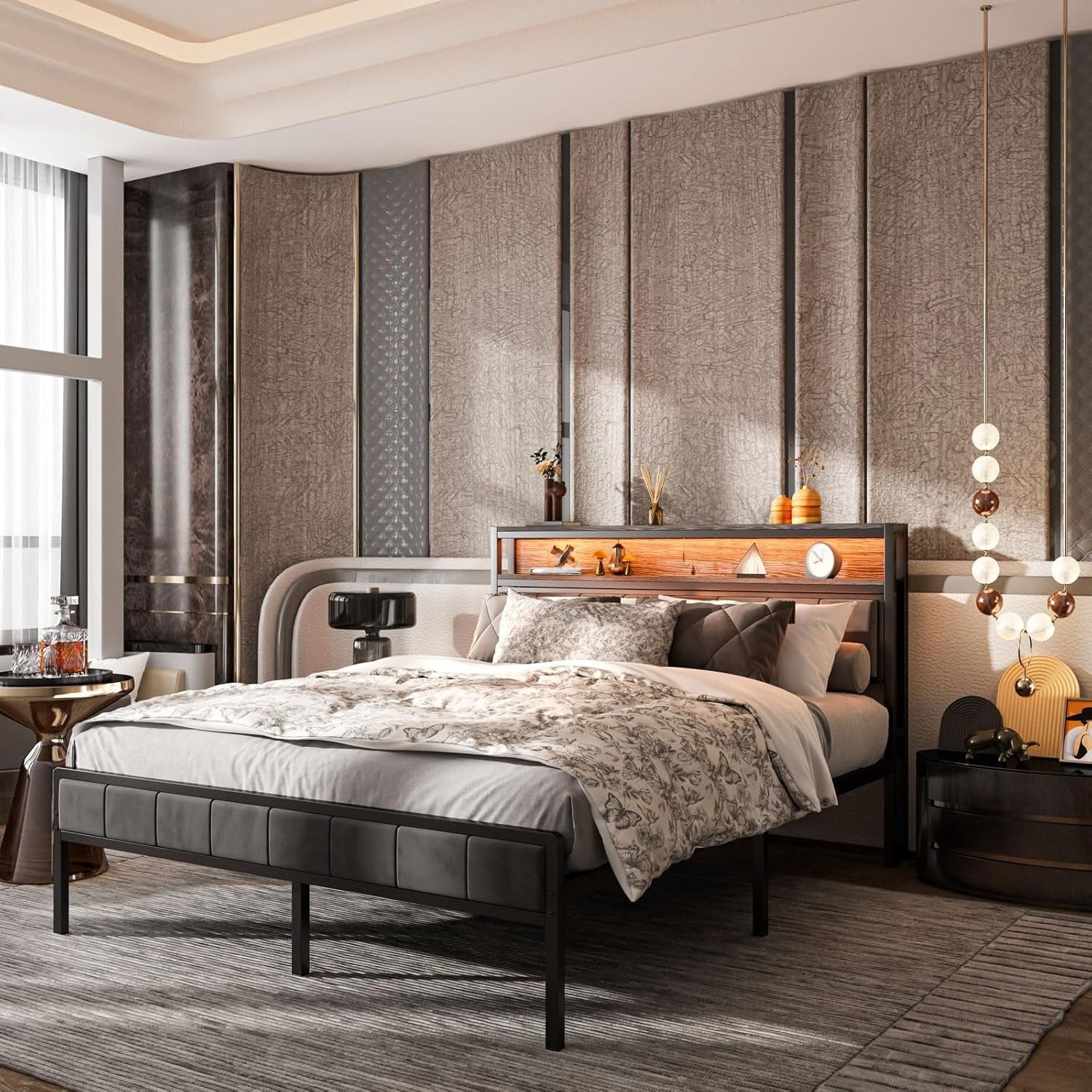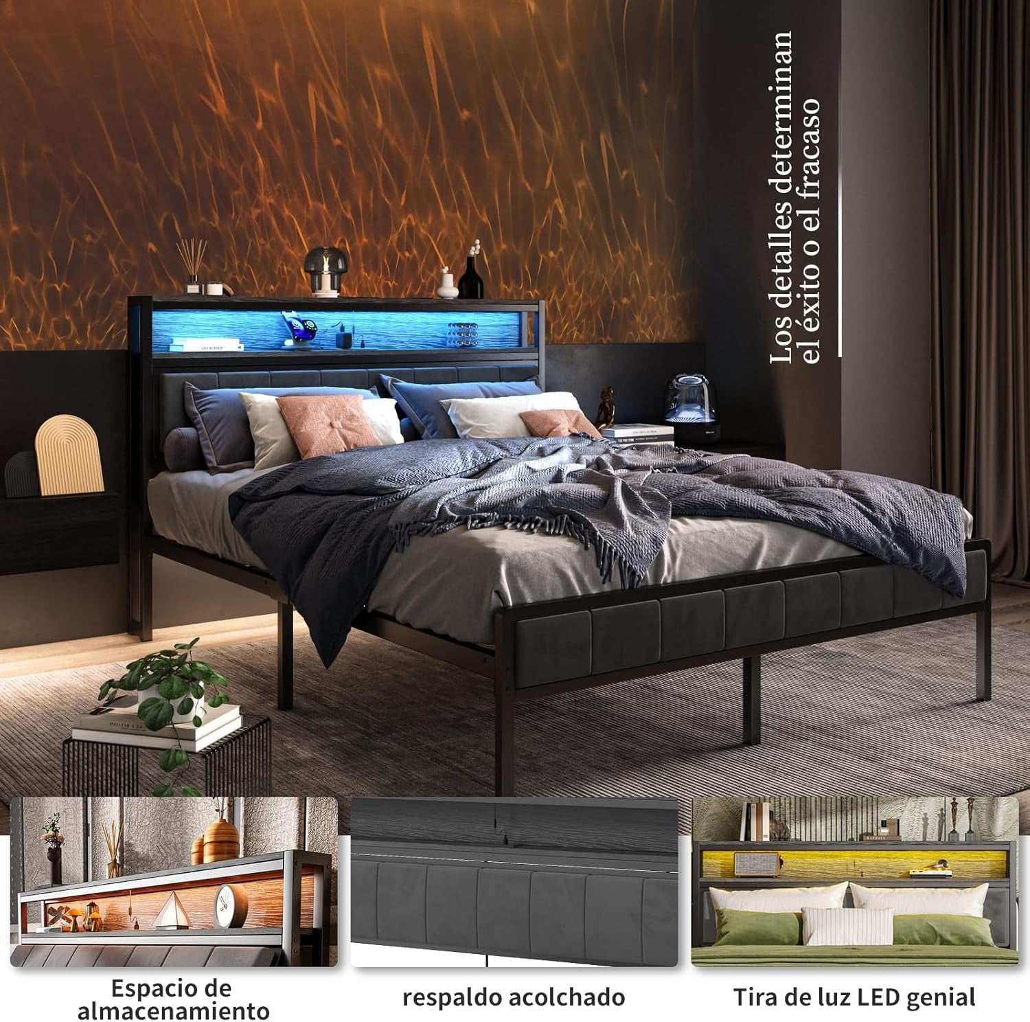 Cama Matrimonial Ajustable Okán – Cabecero con Almacenamiento, Cojines Grises, 2 Puertos USB y Luces LED