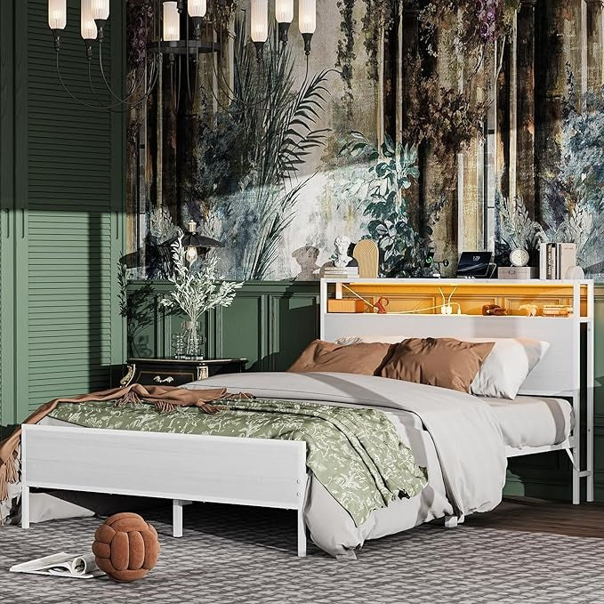 Cama Matrimonial con Cabecero de Almacenamiento, Base de 1.4 m con Luces LED, Contactos de Carga y Puertos USB – Blanco Moderno