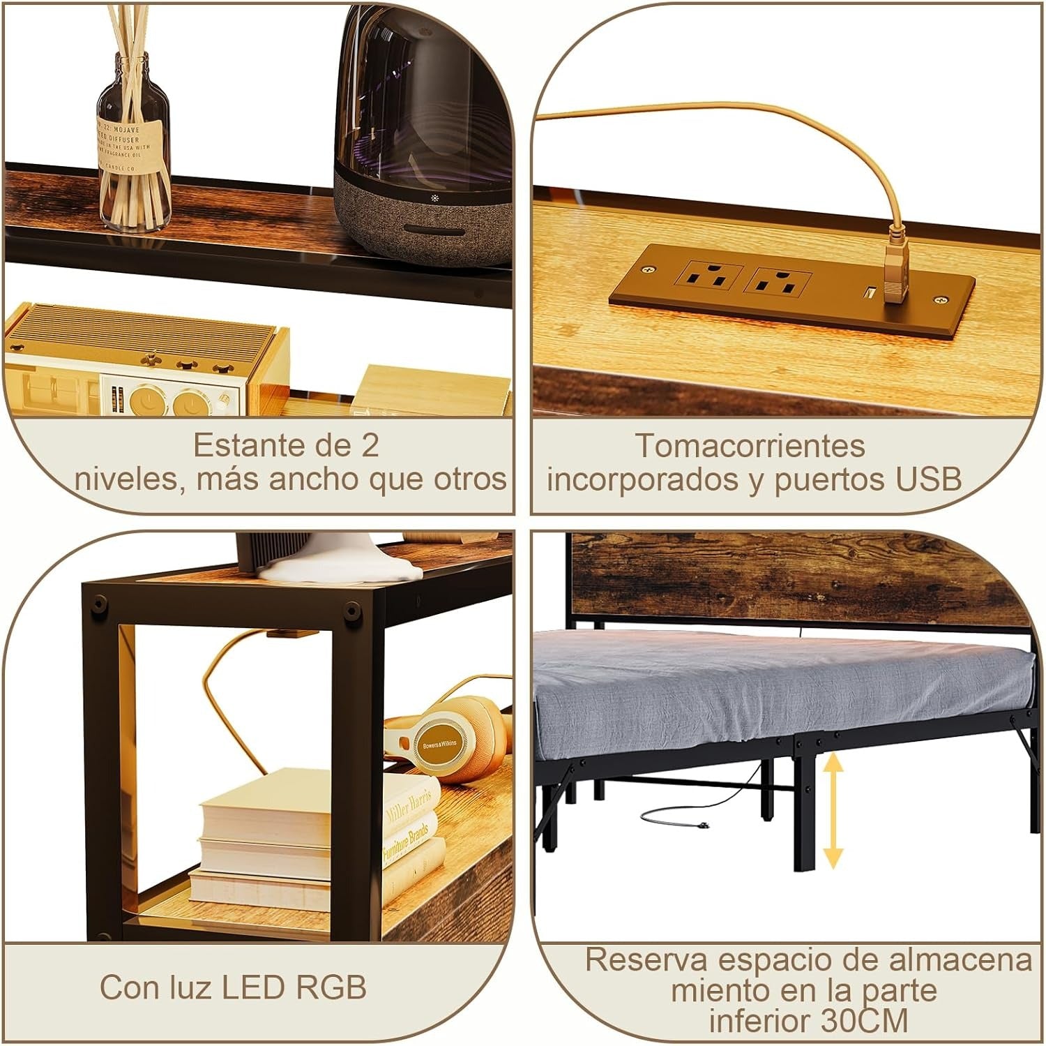 Equipada con luces LED suaves, esta cama crea un ambiente acogedor y relajante, perfecto para leer o descansar. Además, incluye 2 salidas de carga y 2 puertos USB, para que tus dispositivos electrónicos siempre estén listos sin necesidad de enchufes adicionales.