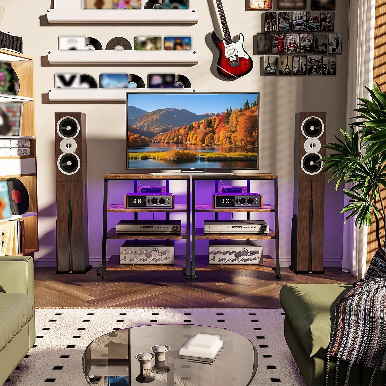 Soporte para Bocinas Vintage 4 Niveles – Estante Multimedia con Ruedas, Regleta, Luz LED y Esquinero 60×48×80 cm